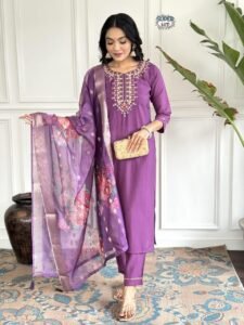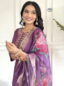 Featuring beautiful Heavy Suit Set which is beautifully decorated with intricate embroidery, Zari weaving . It is paired with matching pants and jecard print Dupatta.
