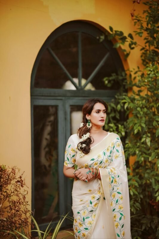 Yellow flower Embroidery Cotton saree